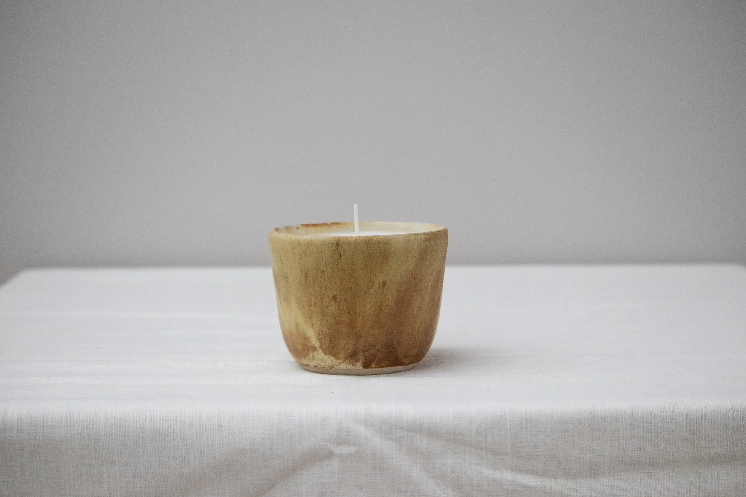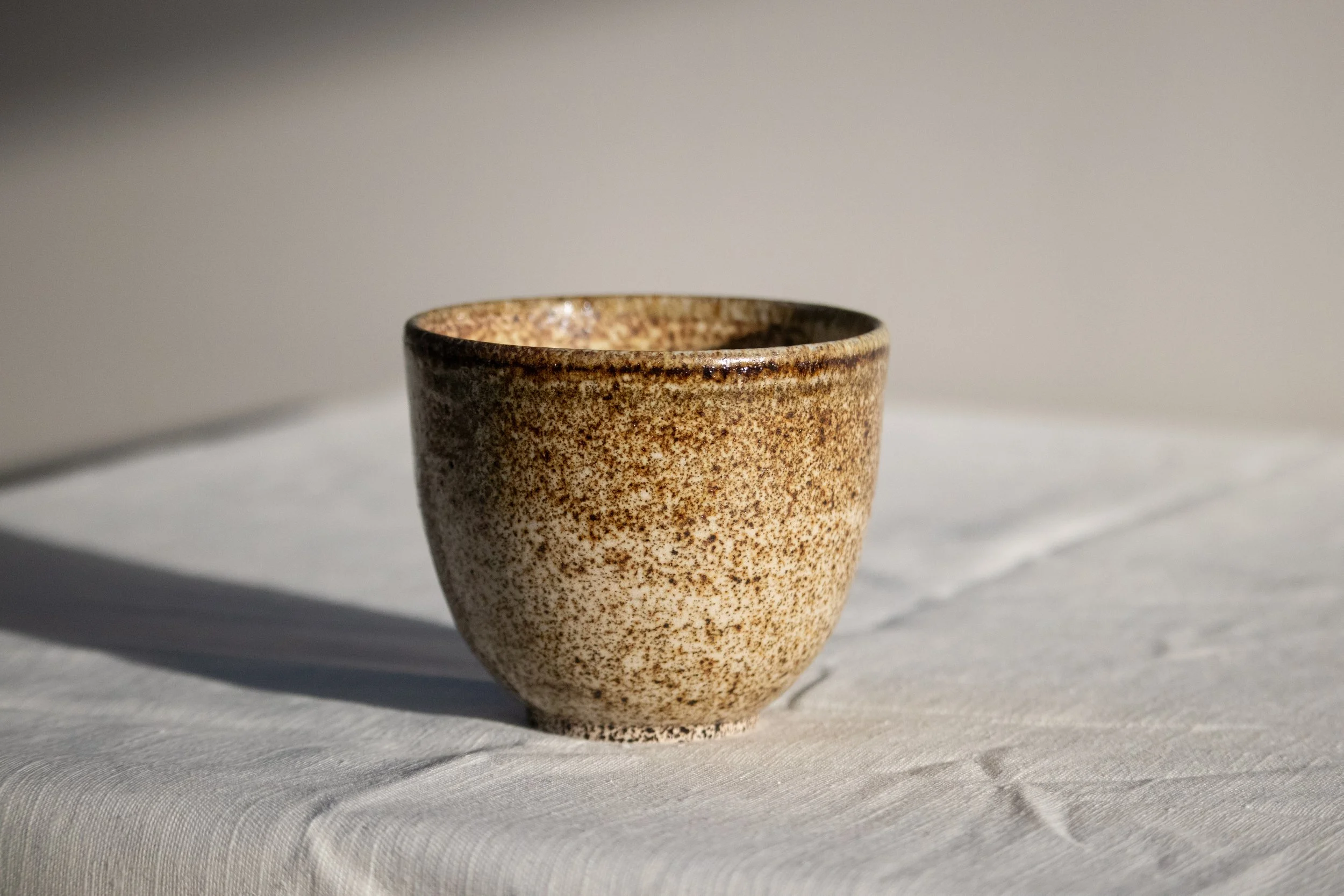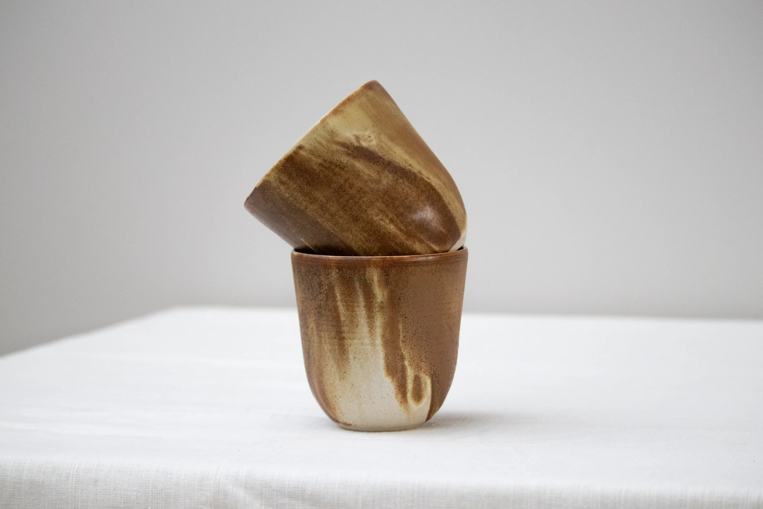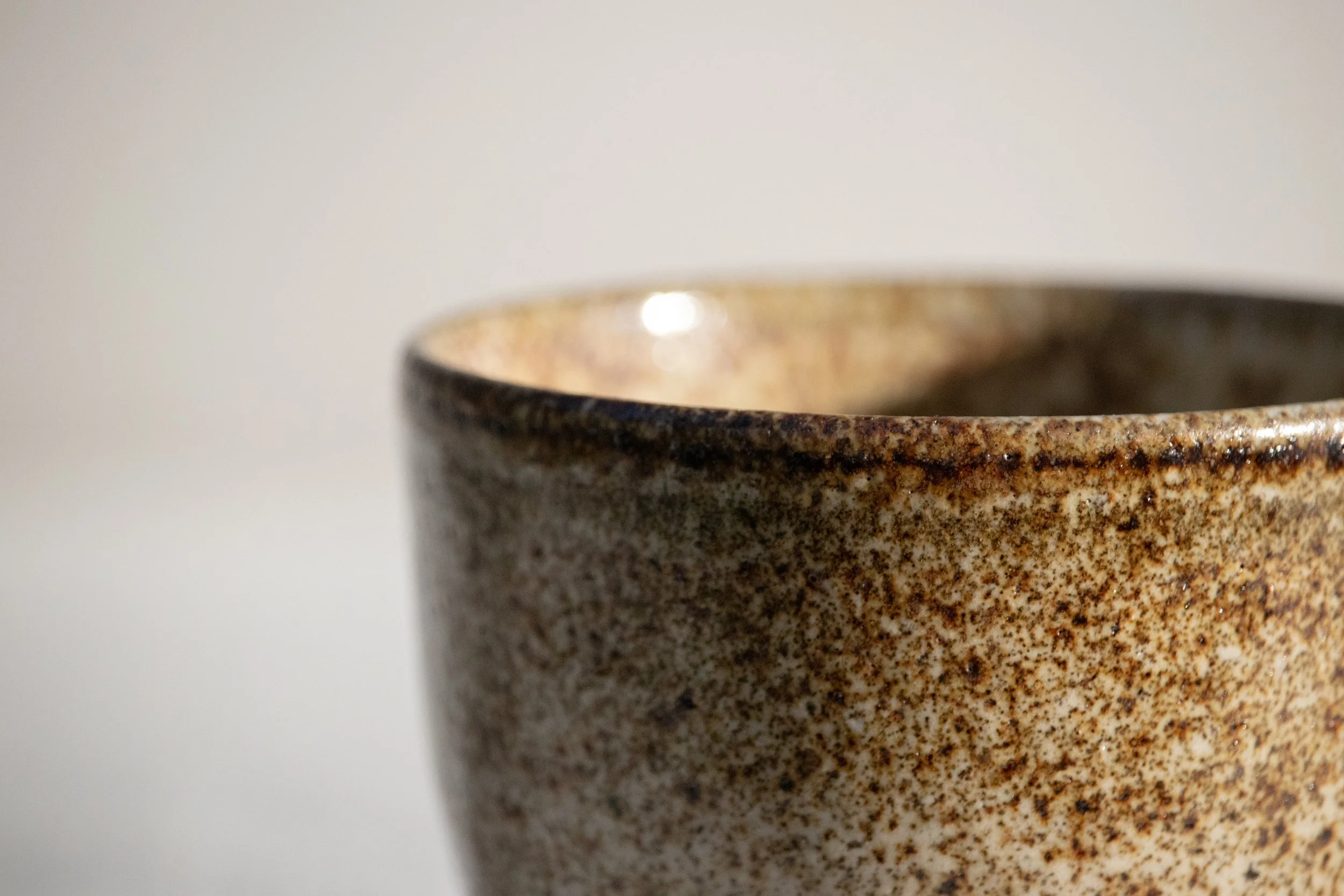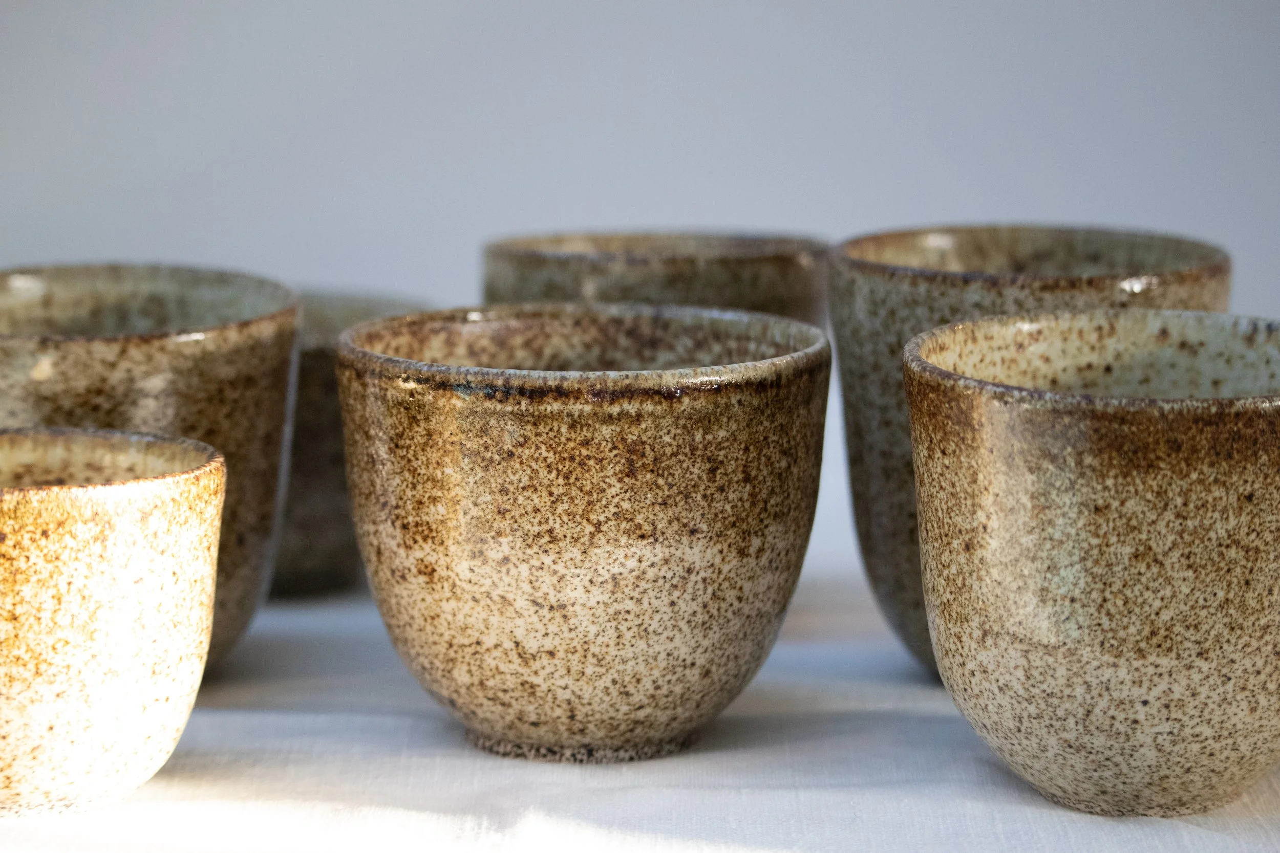 Here I used a coarse black sand I found in Vík, a black sand beach on the South coast of Iceland. The sand comes through a lot here and the color turns yellow. I used the same glazes on the interior and exterior as with the black silt cups above.
