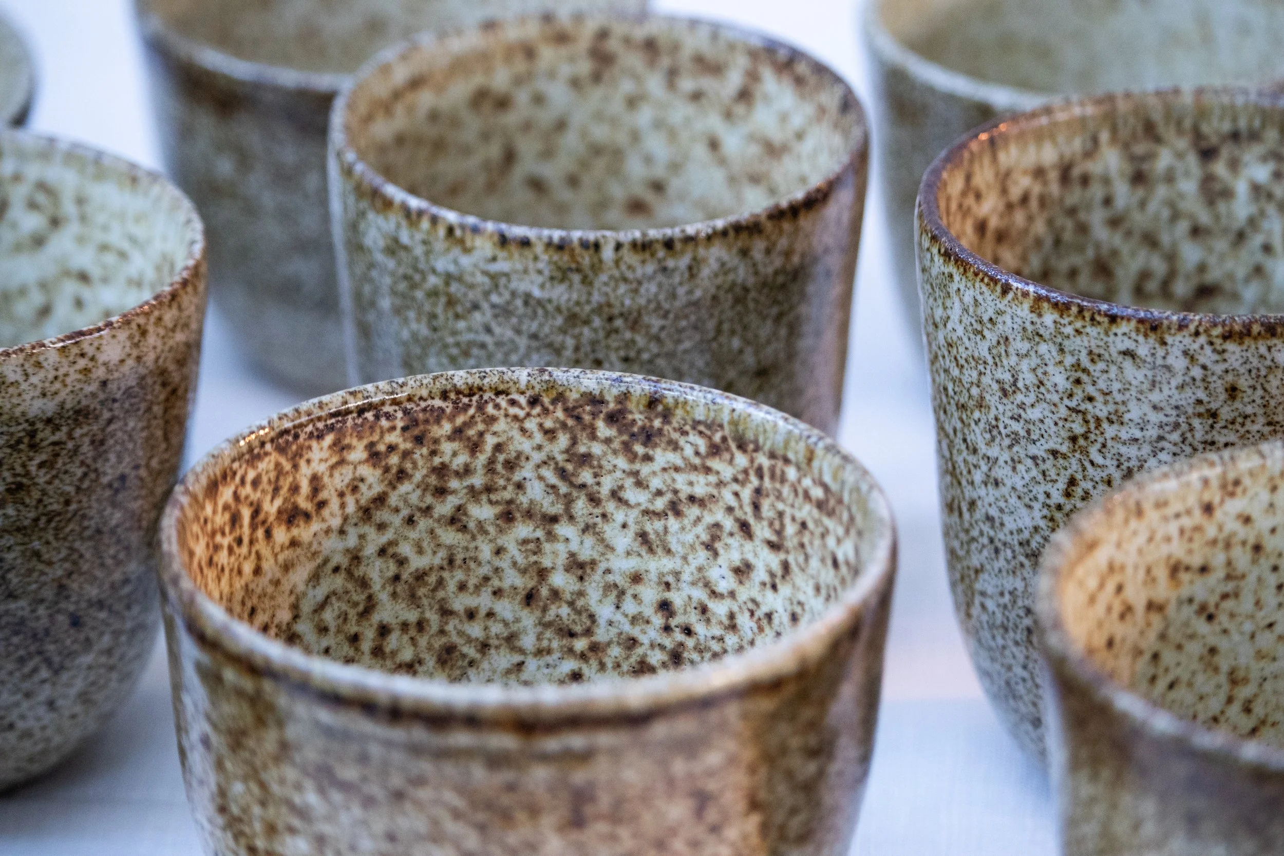 The glaze on these cups was made with added geothermal clay from an active area called Seltún on the Reykjanes peninsula. I harvest the clay by a little stream away from the main delicate geothermal area. The clay is grey in colour, soft and medium in plasticity.
